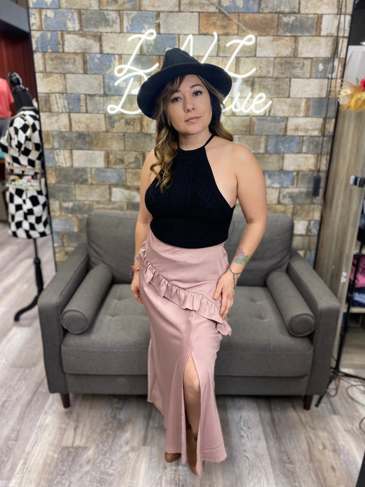 Long pink Skirt with ruffle and slit